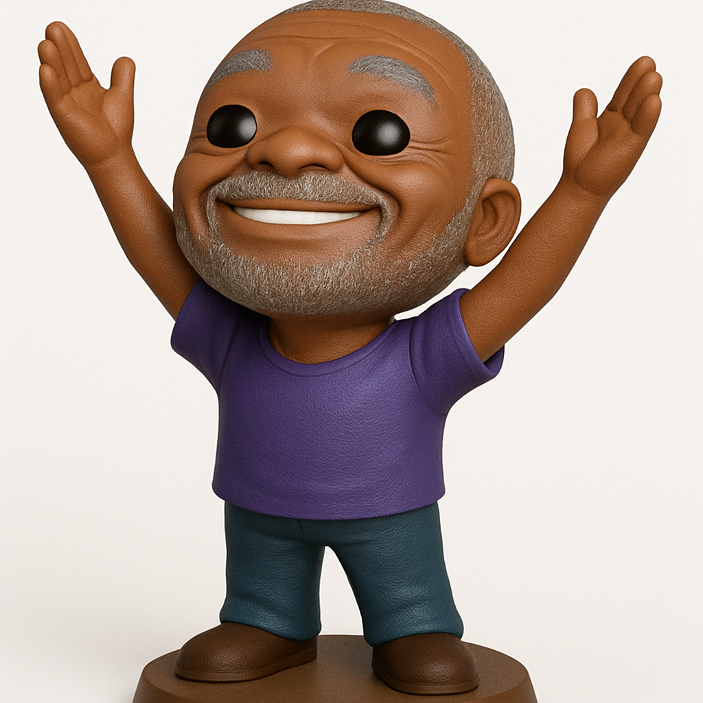 This cheerful figurine is optimized for FDM printing with PLA or PETG. For best results, use a 0.2mm layer height and 15-20% infill. Supports are recommended for the raised arms and chin area to ensure clean overhangs. The model stands approximately 120mm tall on its integrated base, but can be scaled to your preference. Features a charming big smile, detailed gray beard, and textured clothing (purple shirt, teal pants). A multi-part print or careful painting can achieve the vibrant colors shown.