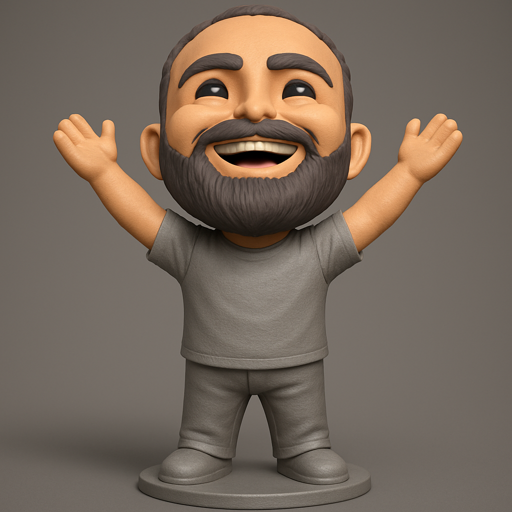 Capture pure joy with this delightful bearded character! Featuring an infectious smile and welcoming pose, he's perfect for your desk. Simple to 3D print.