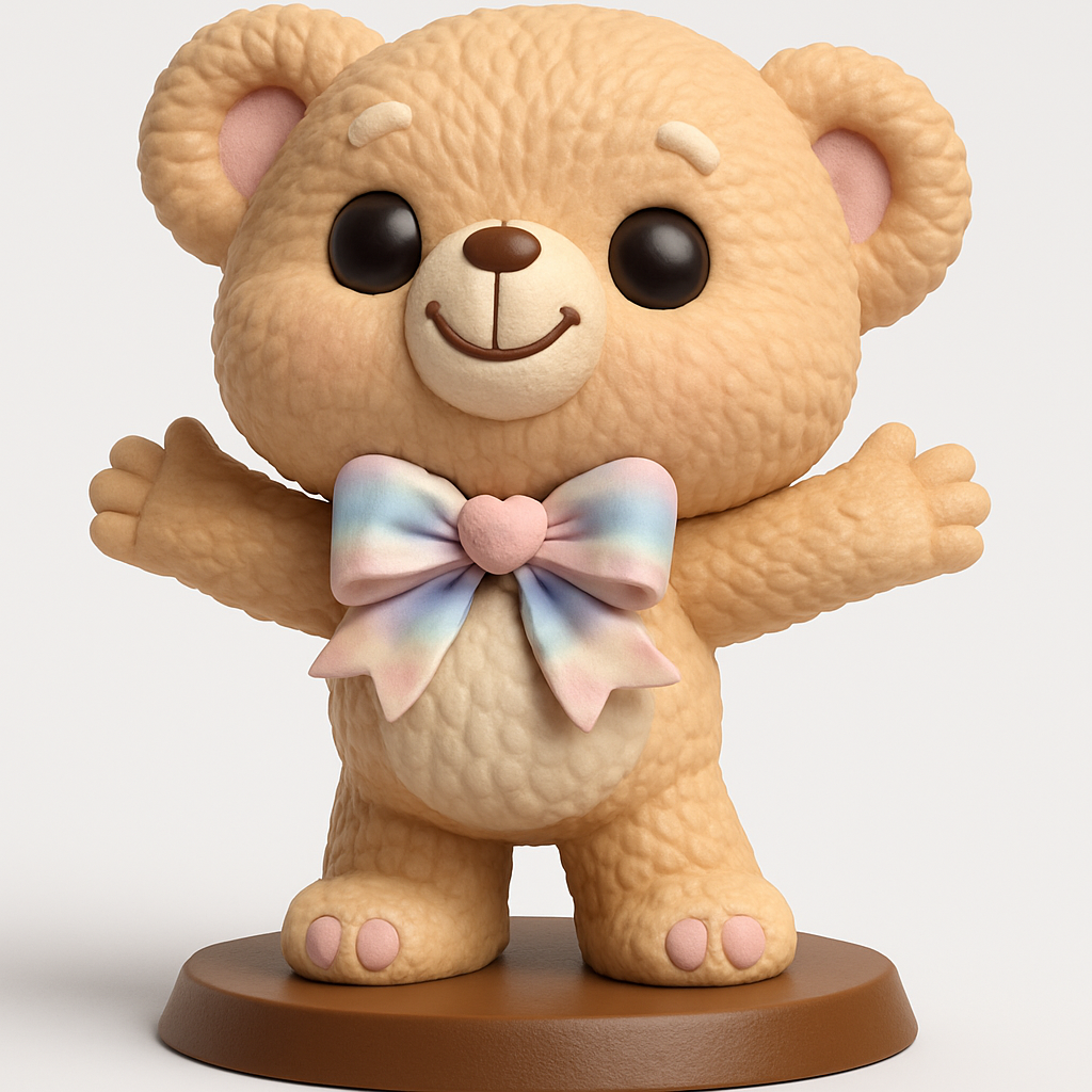 This adorable teddy bear figurine is designed for easy FDM printing. Recommended in PLA or PETG. Achieve smooth details with a 0.15mm-0.2mm layer height and 10-15% infill. Supports will be needed for the chin, arms, and under the bow; tree supports are ideal. The model stands approximately 150mm tall but is easily scalable. Features include a charming textured 'fur' effect, big expressive eyes, a warm smile, and a delightful pastel rainbow bow with a heart accent. Comes with a stable round base. Perfect for gifts or desk decor.