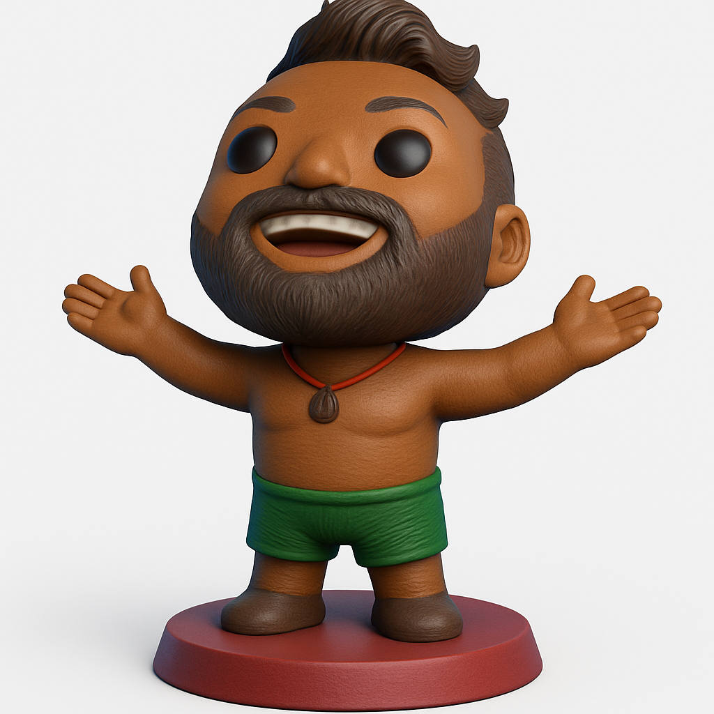 This cheerful bearded islander figurine, inspired by collectible vinyl toys, brings joy to any setting. Designed for FDM printing with PLA or PETG. Recommended settings: 0.16mm-0.2mm layer height, 10-15% infill. Supports are essential for the outstretched arms, beard, and hair overhangs for optimal results. Model dimensions: ~120mm tall, 100mm wide (arm span), 80mm deep. Features a vibrant red base and an iconic welcoming pose. A fun print for personalizing your space!