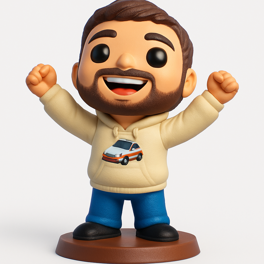 Unleash joy on your desk! This vibrant, stylized figurine of a cheerful bearded car enthusiast, complete with a distinctive car hoodie, makes a perfect collectible or gift.