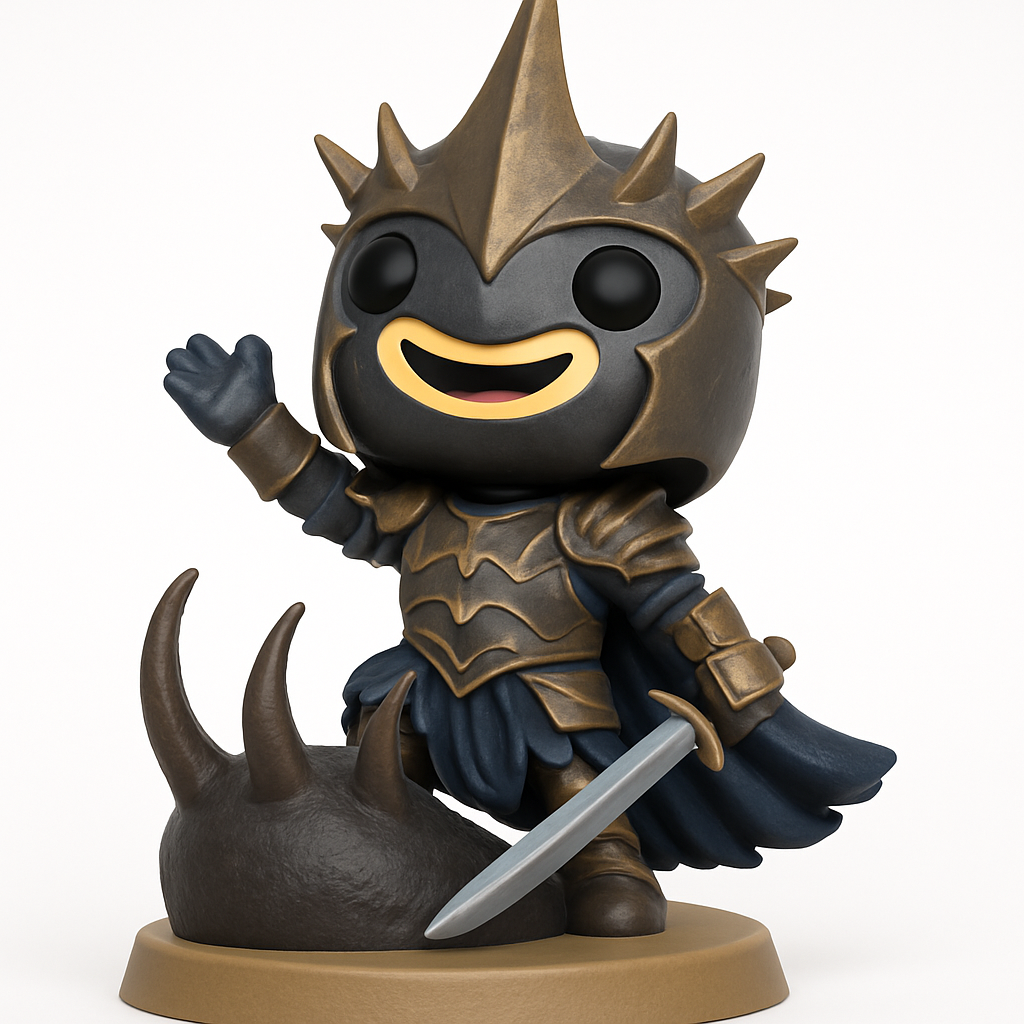 Optimized for FDM printing with PLA or PETG. Recommend 0.16-0.2mm layer height for optimal detail on armor and face. Use 15% infill for stability. Supports are essential for the waving arm, sword, chin/mouth area, cape overhangs, and base horns. Model dimensions: Approximately 160mm H x 100mm W x 90mm D. Features a friendly chibi dark knight with an iconic spiked helmet and detailed bronze-style armor, captured in a cheerful waving pose. Integrated display base includes textured, battle-scarred elements.
