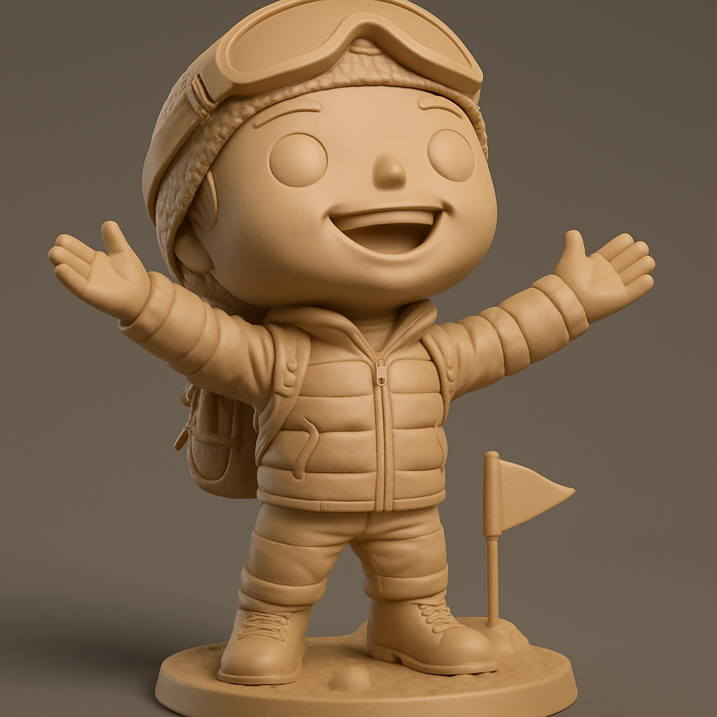 Print this cheerful chibi adventurer at 0.16mm layer height in PLA for best detail. Use 15% infill (cubic/grid) for optimal strength and weight. Supports are necessary for the outstretched arms, head/goggles overhangs, and backpack details to ensure a clean print. Approximate dimensions: 110mm H x 90mm W x 70mm D (at default scale). This charming model features a smiling character in a puffer jacket, beanie, goggles, and hiking boots, complete with a backpack and a small flag on its base. A fun print for any explorer or as a motivational desk piece!