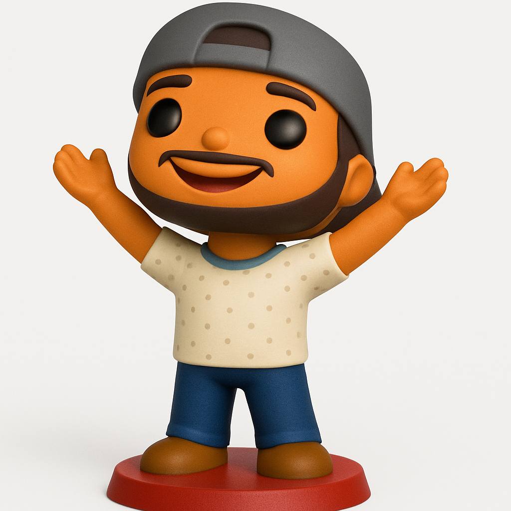 This delightful stylized character figure, standing approx. 120mm tall on its hexagonal base, is optimized for FDM printing. Use PLA or PETG at 0.15-0.2mm layer height and 10-15% infill (gyroid recommended). Supports are advised for the outstretched arms and the slight overhangs under the chin/beard. Features a friendly pose, backward cap, and polka-dot shirt, making it a charming desk companion or gift. A fun, quick print for all skill levels.