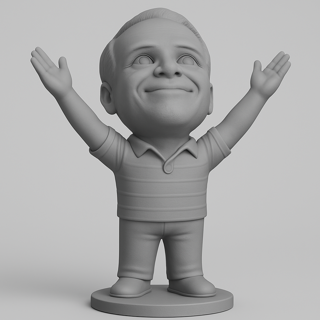 Print this cheerful bobblehead to bring a smile to any space! Ideal for FDM printing with PLA or PETG. Recommended settings: 0.16mm layer height, 10-15% infill (gyroid/rectilinear). Supports are essential for the raised arms and potentially under the chin to ensure a clean print. Model stands approximately 120mm tall on its integrated base, but can be scaled. Features a simple, clean design with a distinct striped polo shirt and an expressive, joyful face. Perfect as a desk ornament or a gift for optimists!