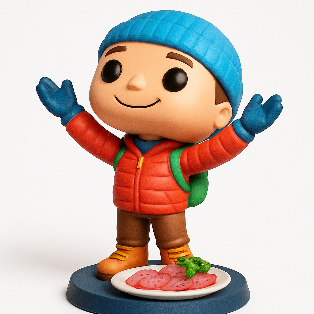Optimized for FDM printing with PLA/PETG. Print with 0.16-0.2mm layer height and 10-15% infill for sturdy results. Supports are recommended for overhangs such as the arms, chin, and the backpack area. This adorable figurine stands approx. 12 cm (4.7 inches) tall, making it perfect for desk display. It features detailed textures on the beanie and puffer jacket, plus a charming small plate with sliced snacks, adding a unique touch. Ideal for multi-color printing or post-processing with paint to highlight its vibrant details.
