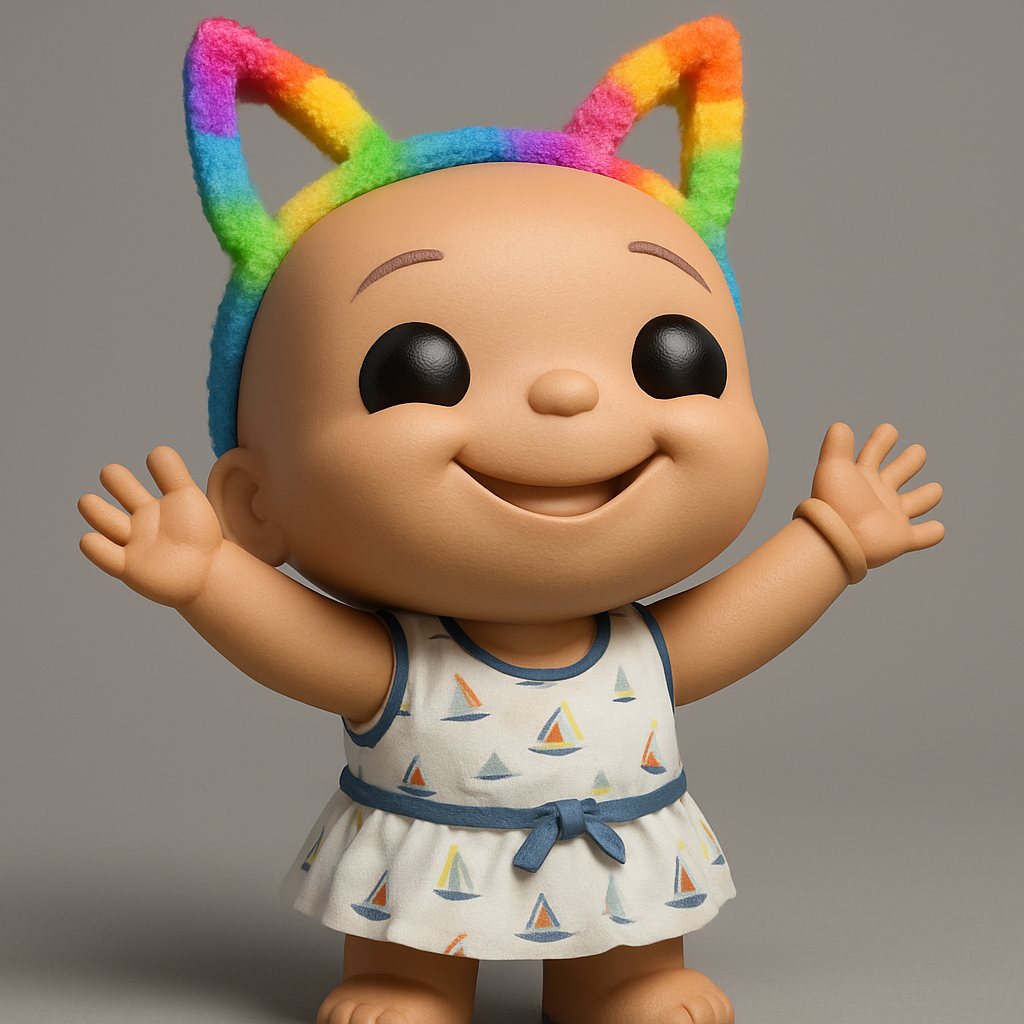 Print this cheerful Rainbow Baby, ideal for desk decor or a delightful toy. Optimized for FDM printing with PLA or PETG at 0.16-0.2mm layer height. Recommend 10-15% infill for a sturdy yet light model. Supports are crucial for the chin and arm undersides. Default size is approx. 120mm tall, easily scalable. Features a vibrant rainbow cat-ear headband, smooth cartoon styling, and a charming sailboat dress. A perfect print for adding a pop of color and joy!