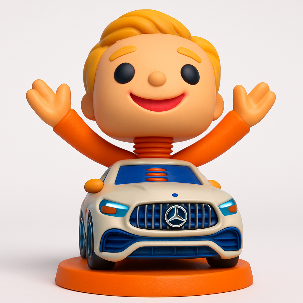 Bring a smile to any space with this unique Mercedes bobblehead! Featuring a cheerful driver popping from a detailed car, it's a perfect desk companion.