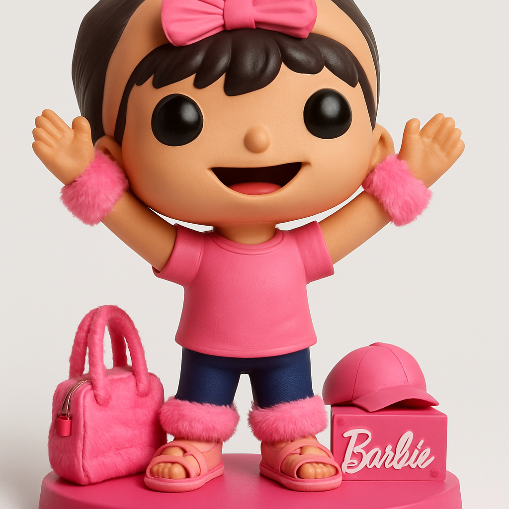 This cheerful Barbie-inspired figurine stands approx. 18cm tall, ideal for desktop display. Print with FDM in PLA or PETG at 0.2mm layer height and 15-20% infill. Supports are essential for the raised arms and under the chin/bow. Key features include vibrant pink furry wristbands, boot cuffs, a matching handbag, a baseball cap, and a detailed Barbie logo box. Consider multi-color printing or post-processing for accents. A delightful collectible!
