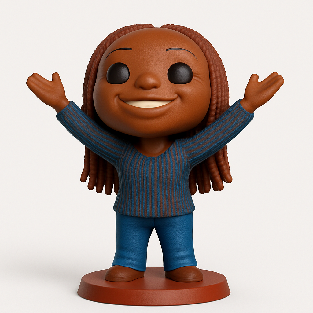 This charming, stylized figurine features a joyful character with braided hair, open arms, and a warm smile, standing on a sturdy base. Ideal for adding a touch of positivity to your desk or shelf. For FDM printing, PLA or PETG at 0.16mm layer height and 10-15% infill is recommended for a balanced finish. Supports will likely be needed for the arms and potentially under the chin. Approximate dimensions: 120mm tall, 80mm wide, 60mm deep. Consider multi-color printing for the distinct blue/brown sweater, skin tone, hair, blue jeans, brown shoes, and reddish-brown base to bring out its vibrant personality.