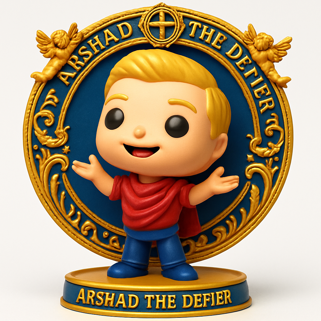Immortalize Arshad The Defier with this vibrant Funko-style collectible figurine! Featuring an ornate gold & blue display stand, it's a perfect desk companion or fan gift. Print in multiple colors for a stunning finish!