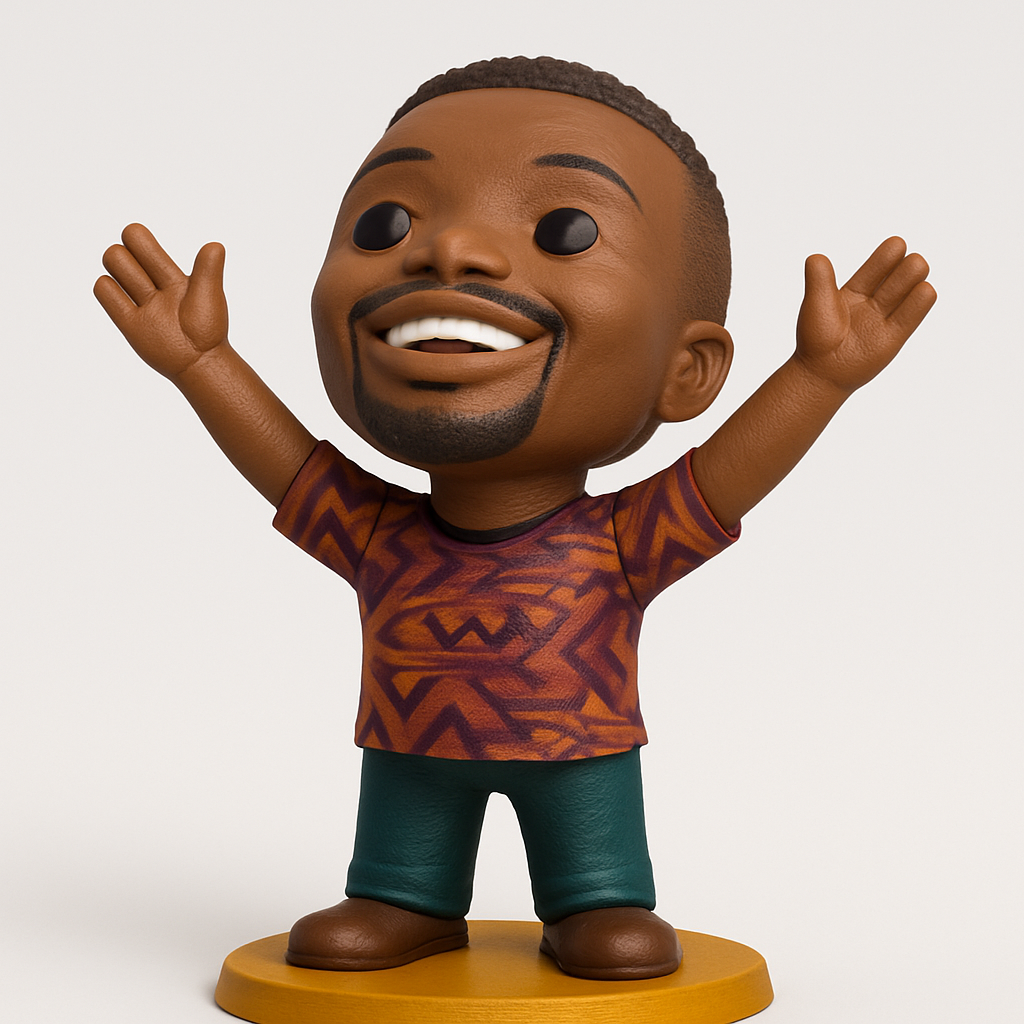 This charismatic 3D model depicts a smiling Black man with arms raised in celebration, ideal for FDM printing. Recommend PLA or PETG for vibrant colors. Print at 0.15-0.2mm layer height with 15-20% infill. Supports will be necessary for the raised arms and potentially the chin area. Approximate dimensions: 150mm tall x 100mm wide (at arms) x 80mm deep. Features textured skin, a patterned shirt, and a sturdy round base. A great piece for desk decoration or as a thoughtful gift.