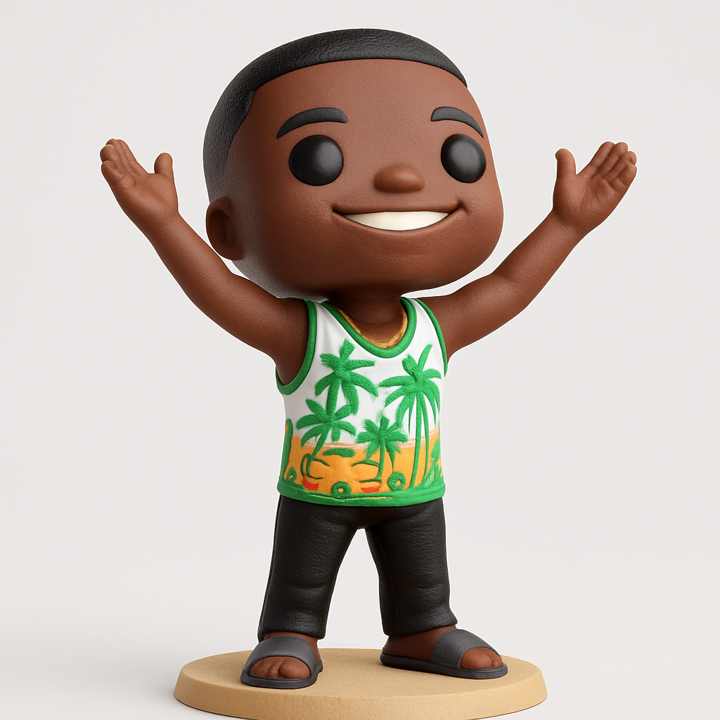 Print this charming Funko-style figurine with ease! Ideal for FDM printers using PLA or PETG. Recommend 0.16mm-0.2mm layer height for fine detail, 10-15% infill. Supports needed for underarms and chin for best results. Dimensions: Approx. 10 cm tall, 7 cm base diameter. Features a vibrant tropical shirt, engaging pose, and cheerful smile. Great for multi-color printing to capture the intricate details of the outfit. Enjoy a perfect desk companion!