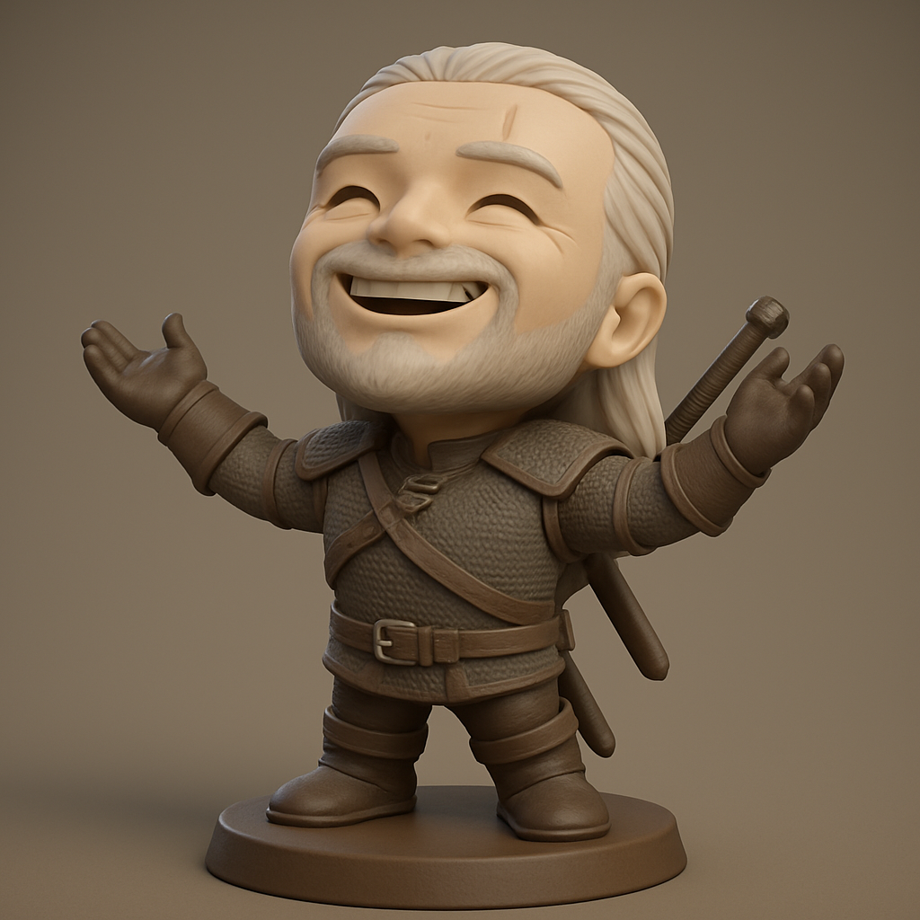 Capture Geralt's rare happy side! This charming chibi model features the beloved Witcher with open arms and a huge smile. A must-have for any fan!