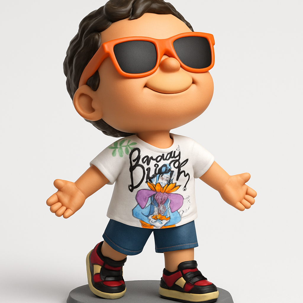 FDM optimized for PLA/PETG. For best results, print at 0.16-0.2mm layer height with 10-15% infill (gyroid). Supports are recommended for the chin, underside of arms, and possibly the brow of the sunglasses. The model stands approximately 150mm tall, but can be scaled to fit your needs. Features include vibrant orange sunglasses, a detailed graphic tee, and multi-color potential for separate prints of hair, skin, clothes, and shoes, ensuring a striking display piece.