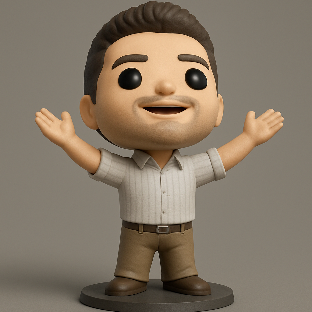 This charming Funko Pop-style male figurine is ideal for FDM printing. Recommend PLA or PETG. Print at 0.15-0.2mm layer height with 10-15% infill. Supports are crucial for the outstretched arms and potentially the chin/nose. Dimensions (approx.): H 95mm x W 80mm x D 60mm. Features a friendly, open-armed pose, characteristic large eyes, and textured shirt detail, all on a stable integrated base. A delightful display piece for any collector or desk.
