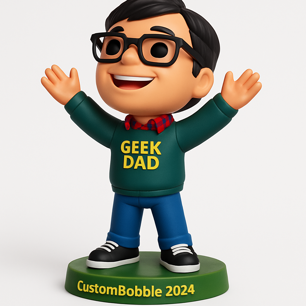 Bring a smile to any tech-loving father with this adorable 'Geek Dad' bobblehead! Features a cheerful pose, stylish glasses, and a 'CustomBobble 2024' base.