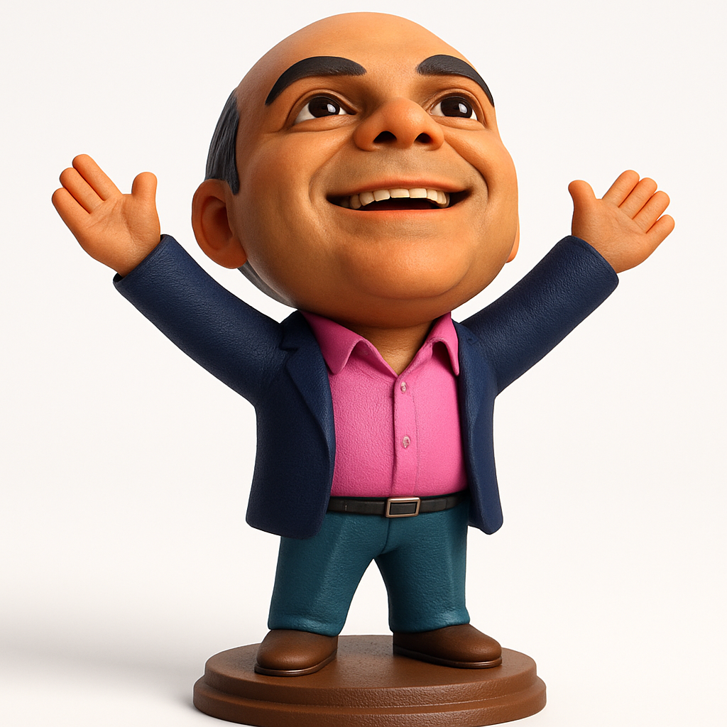 Print this cheerful bobblehead to add a dose of happiness to your workspace! Designed for FDM printing with PLA or PETG. Optimal layer height: 0.2mm. Infill: 15-20% for good structural integrity. Supports are recommended for the raised arms and potentially the chin area. Model dimensions: approximately 180mm (H) x 120mm (W) x 100mm (D). Features a highly expressive, smiling face, a dynamic 'arms open' pose, and crisp clothing details. The sturdy base ensures stability. Multi-color printing or post-processing with paint can enhance its vibrant look.