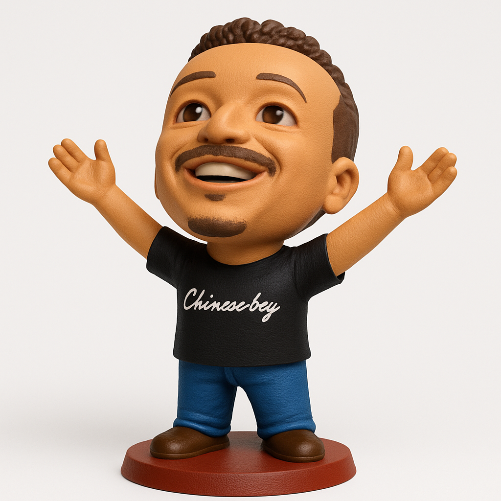 Bring boundless joy to your space with this unique bobblehead! Featuring a smiling figure in a "Chinese boy" tee with open arms, it's a perfect conversation starter or desk companion.