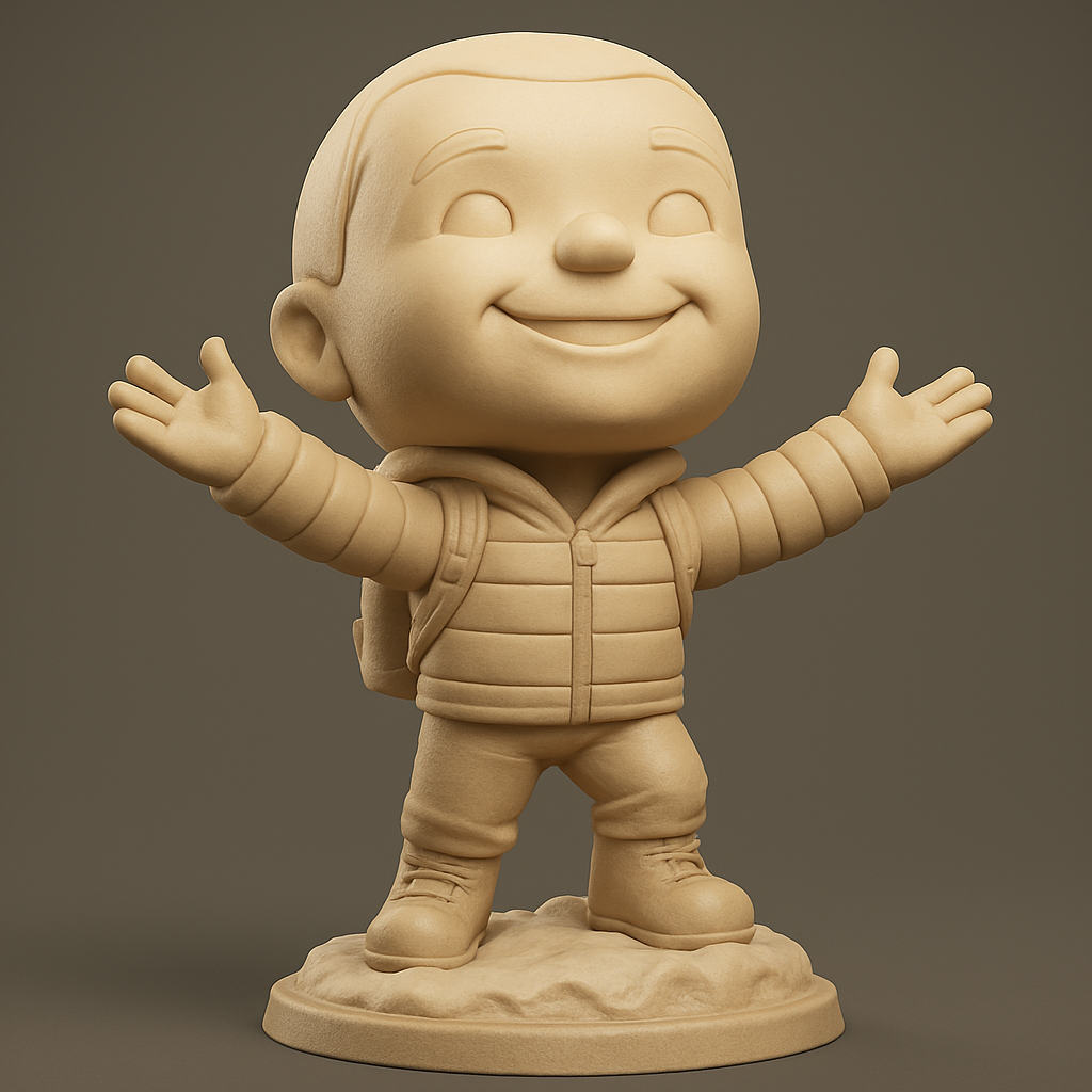 Spread positivity with this delightful 3D printable figurine! Featuring a cheerful boy in a puffer jacket and backpack, perfect for any desk or shelf.