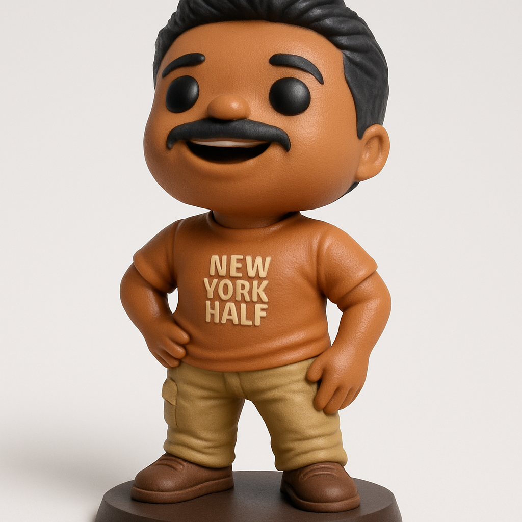 This cheerful 'New York Half' runner figure is optimized for FDM printing. Recommend PLA or PETG. Print at 0.15-0.2mm layer height with 10-20% infill. Minimal supports needed for the chin/arms. Model stands approx. 120mm (4.7in) tall. Features iconic mustache, detailed shirt text, and a vibrant pose. Multi-color printing or post-print painting recommended for best aesthetic.