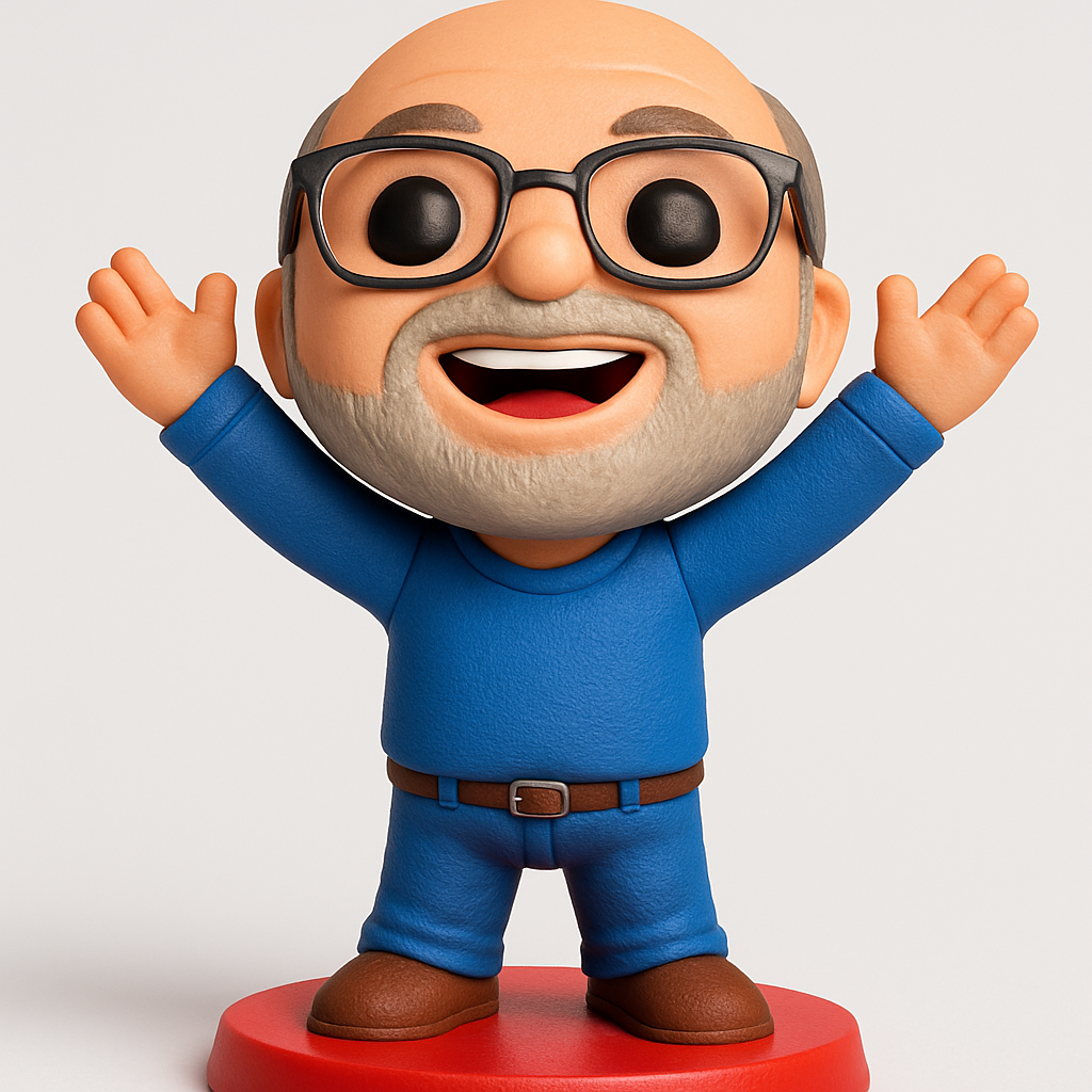 Print this delightful, positive vibe figurine in PLA or PETG for best results. We recommend a 0.2mm layer height and 15% infill for a good balance of detail and speed. Supports will be needed for the arms, chin, and possibly under the belt. The model stands approximately 120mm tall, 80mm wide, and 80mm deep, providing a compact desk companion. Features include a cheerful expression, detailed glasses, a textured beard, and textured clothing on a stable round base. Consider multi-color printing for specific details like the belt, shoes, and base.