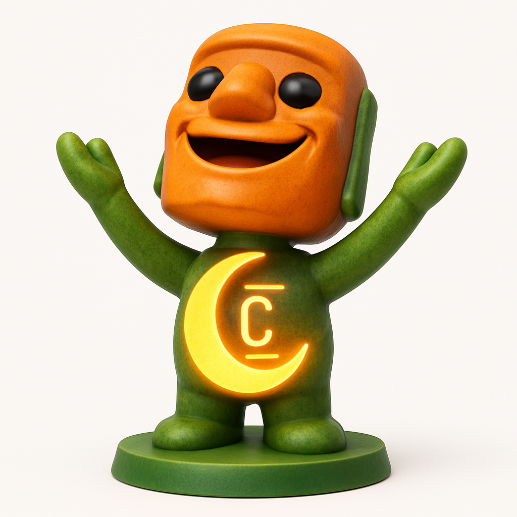 This cheerful figurine, standing approximately 120mm tall, is optimized for FDM printing. For best results, use PLA or PETG with a 0.2mm layer height and 15% infill. The model can be printed in two primary parts (head and body) to easily achieve the two-tone orange and green design without an AMS/MMU. Supports are recommended for the raised arms and potentially the chin area. The 'C' symbol on the chest is recessed, perfect for painting with glow-in-the-dark paint or using a translucent filament for a luminous effect.