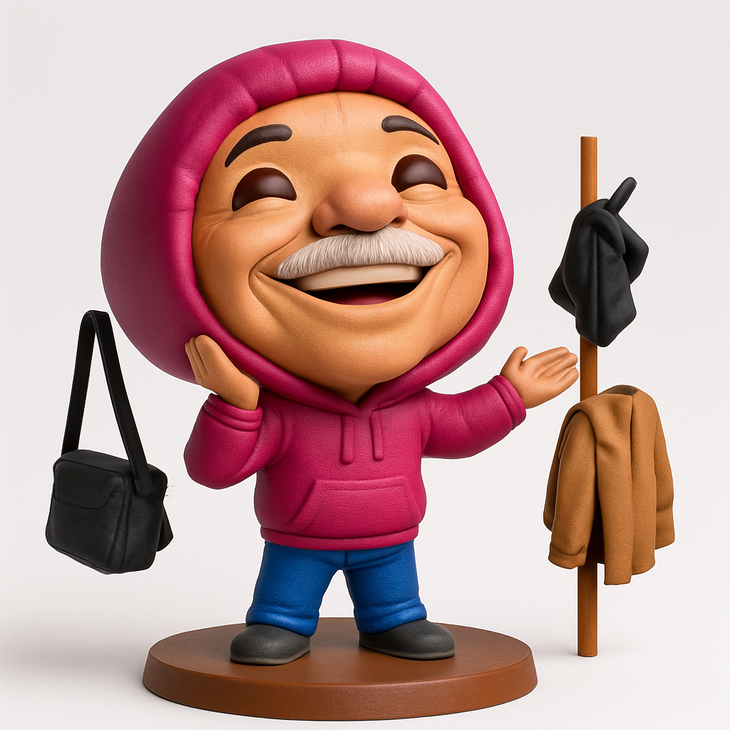 Bring a burst of joy to any space with this vibrant figurine! Features a laughing grandpa in a cozy hoodie, complete with a coat stand & bag. A truly happy print!