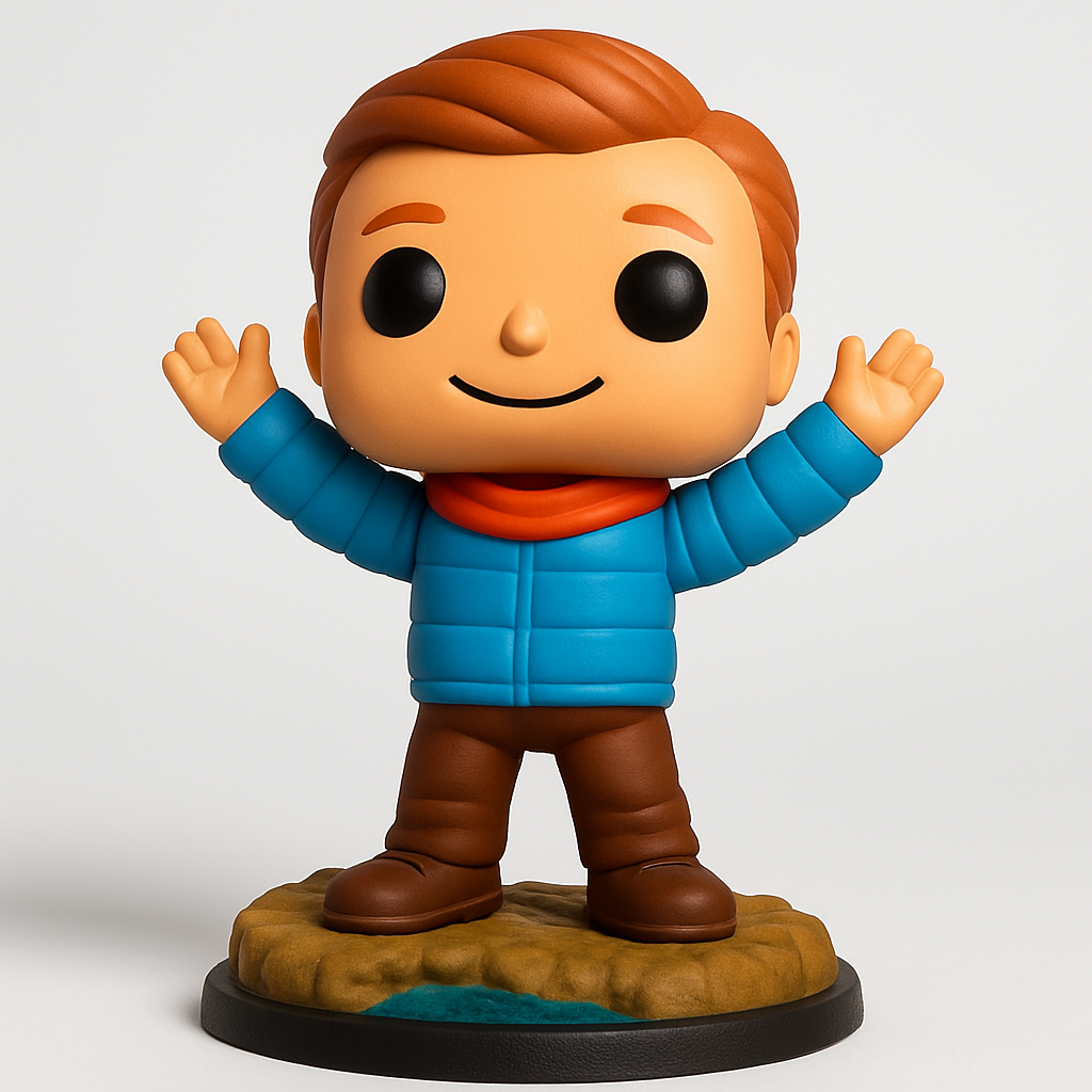 Print this charming Funko-style figurine! Stands approx. 100mm tall with a 60mm diameter base. Ideal for FDM printing in PLA or PETG. Recommend 0.16-0.2mm layer height and 15% infill for a sturdy display piece. Supports are advised for under the arms, chin, and any significant overhangs on the base. The model features a friendly waving pose, a distinct puffy jacket, and a textured base with a small 'water' detail, making it a delightful collectible or gift.