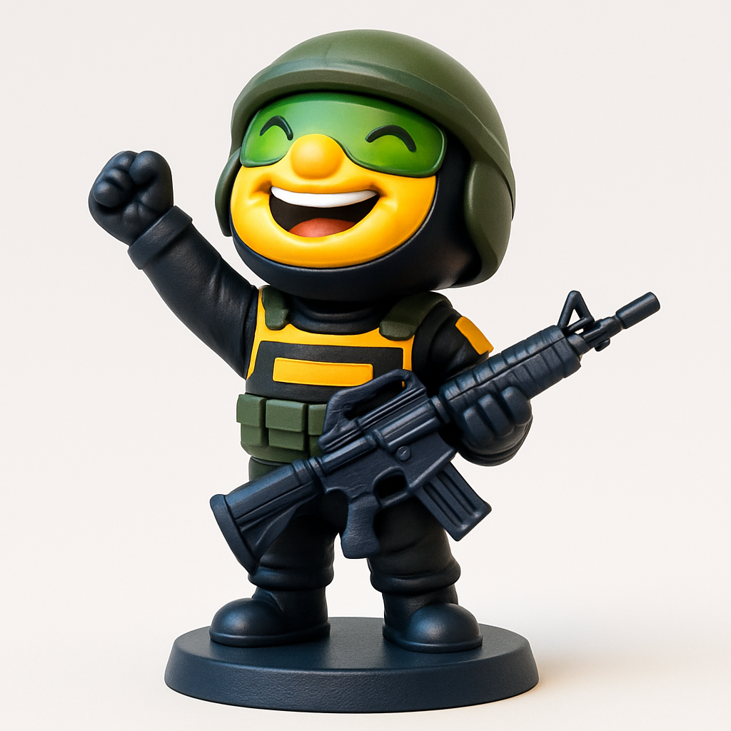 Unleash your inner champion with this cheerful tactical trooper. Dynamic victory pose, detailed gear, and a vibrant emoji face make it a must-print for any fan!